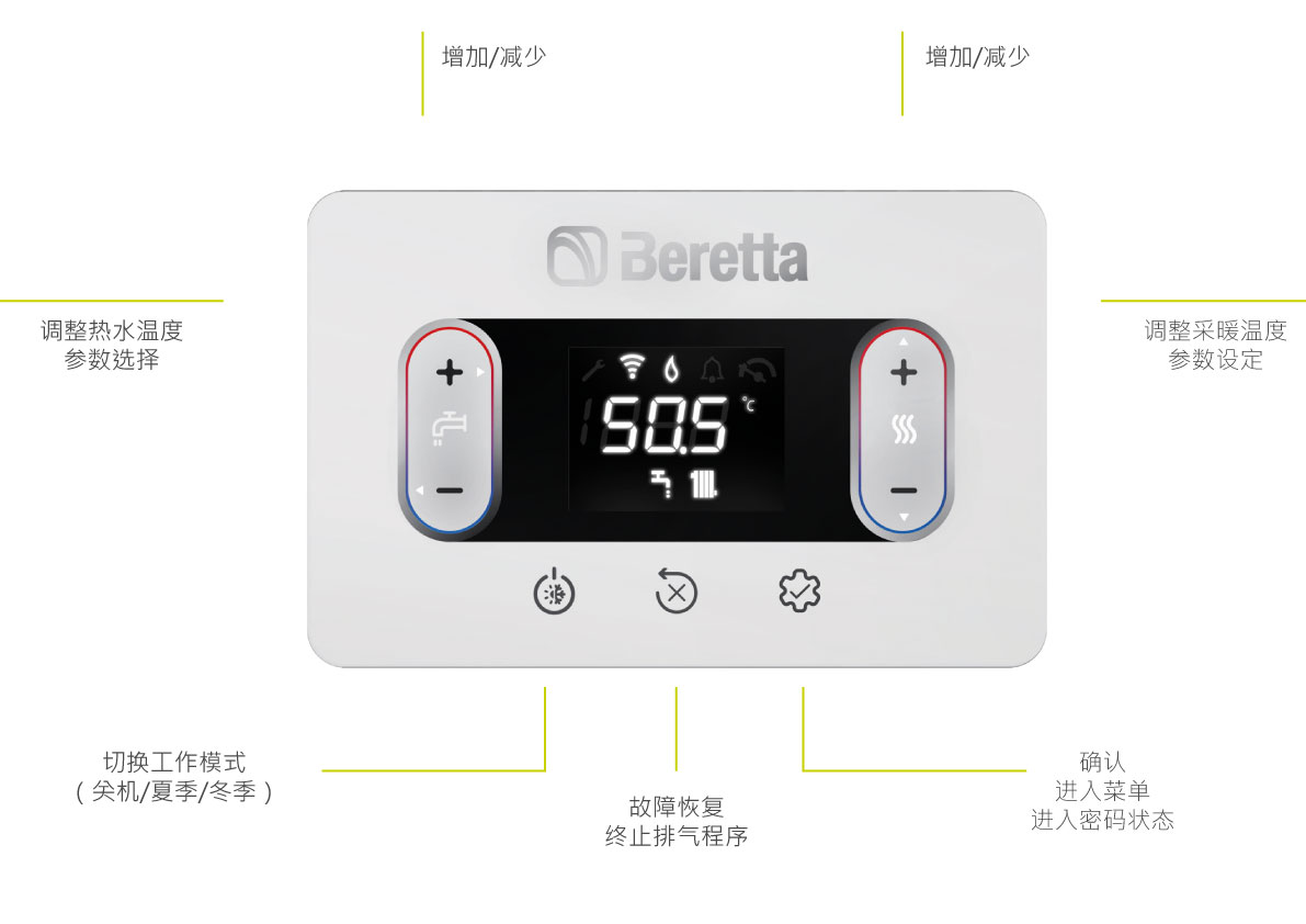 双功能机型中,配备 Beretta 自主研发制造的高性能板式换热器,实现生活热水(DHW)功能。